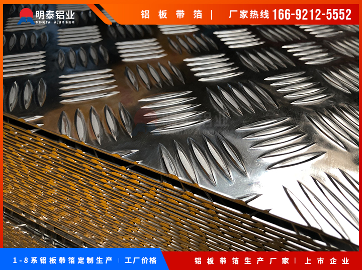 花纹铝板又名防滑铝板,主要产品有1、3、5、6系铝合金板材,明泰铝业可生产一条筋、三条筋、五条筋花纹板等,合金牌号有1060/3003、5052/5754/6061等。花纹铝板广泛应用于建筑、车辆、船舶等防滑用地板、装饰装潢等领域。